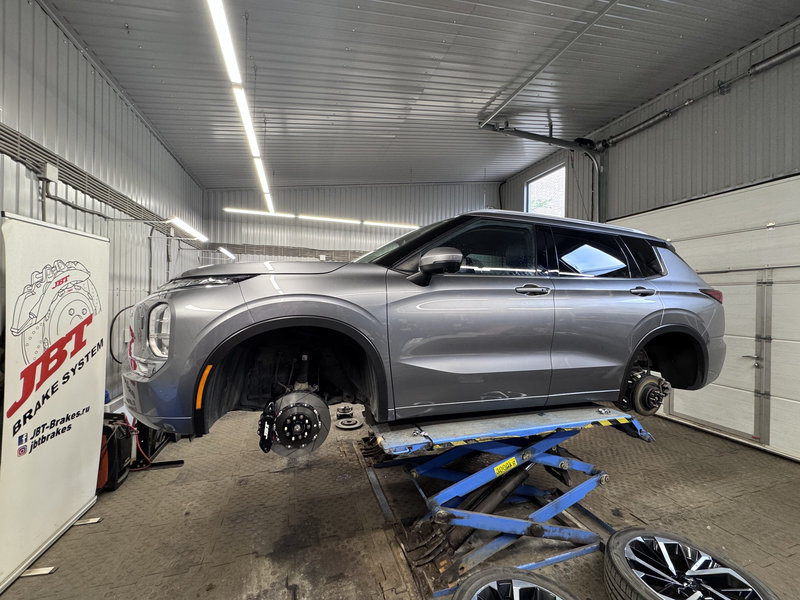 Замена передней тормозной системы на кроссовере Mitsubishi Outlander IV: и для «параллельных» у нас есть гарантия.Сегодня речь пойдет о японском среднеразмерном кроссовере Mitsubishi Outlander IV по случаю недавно реализованного проекта. Это дебютный проект с «чужестранцем» (перевод с англ.языка) 4-ой генерации в нашей коллекции. Так что еще один прецедент создан! Надо отметить, что представители данного семейства являются «редкими гостями на нашей поляне», не смотря на большую популярность данной модели в нашей стране: последний раз мы писали о Mitsubishi Outlander в 2022 году, и это был представитель 3-го поколения. А дело в том, что его массо-мощностные характеристики в отличие от полноразмерных кроссоверов и внедорожников примерно соответствуют производительности его штатной тормозной системы. Тут присутствует некий баланс: контрмомент, создаваемый на колесе совокупной (на 4-х колесах) тормозной парой (колодки-диски), неплохо справляется с максимальным импульсом и инерцией автомобиля. С другой стороны, типовой профиль владельца Аутлендера: мужчина средних лет, семейный, обладатель загородной недвижимости с приемлемым подъездом, не предполагает наличия «замашек» гонщика. Как говорится: все в меру. Как вывод, владельцам Аутлендеров в общей своей массе производительные полуспортивные системы JBT просто не нужны. Они избыточны. И когда в нашу компанию обращается очередной владелец Аутлендера, причину следует искать в чем-то другом. Ну и западные санкции сильно подпортили общую картину: «Аутлендеры» 4-го поколения поступают в Россию исключительно по каналам параллельного импорта. И их совсем немного. Напомним, что кроссоверы Mitsubishi Outlander производятся японской корпорацией Mitsubishi с 2001 года в 4-м поколении (годы выпуска 2021 – 2025); SUV, J-сегмент; 5 дверей. Приведем основные характеристики Outlander IV в максимальной модификации 2,5 CVT: